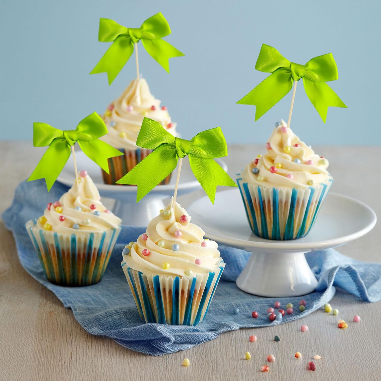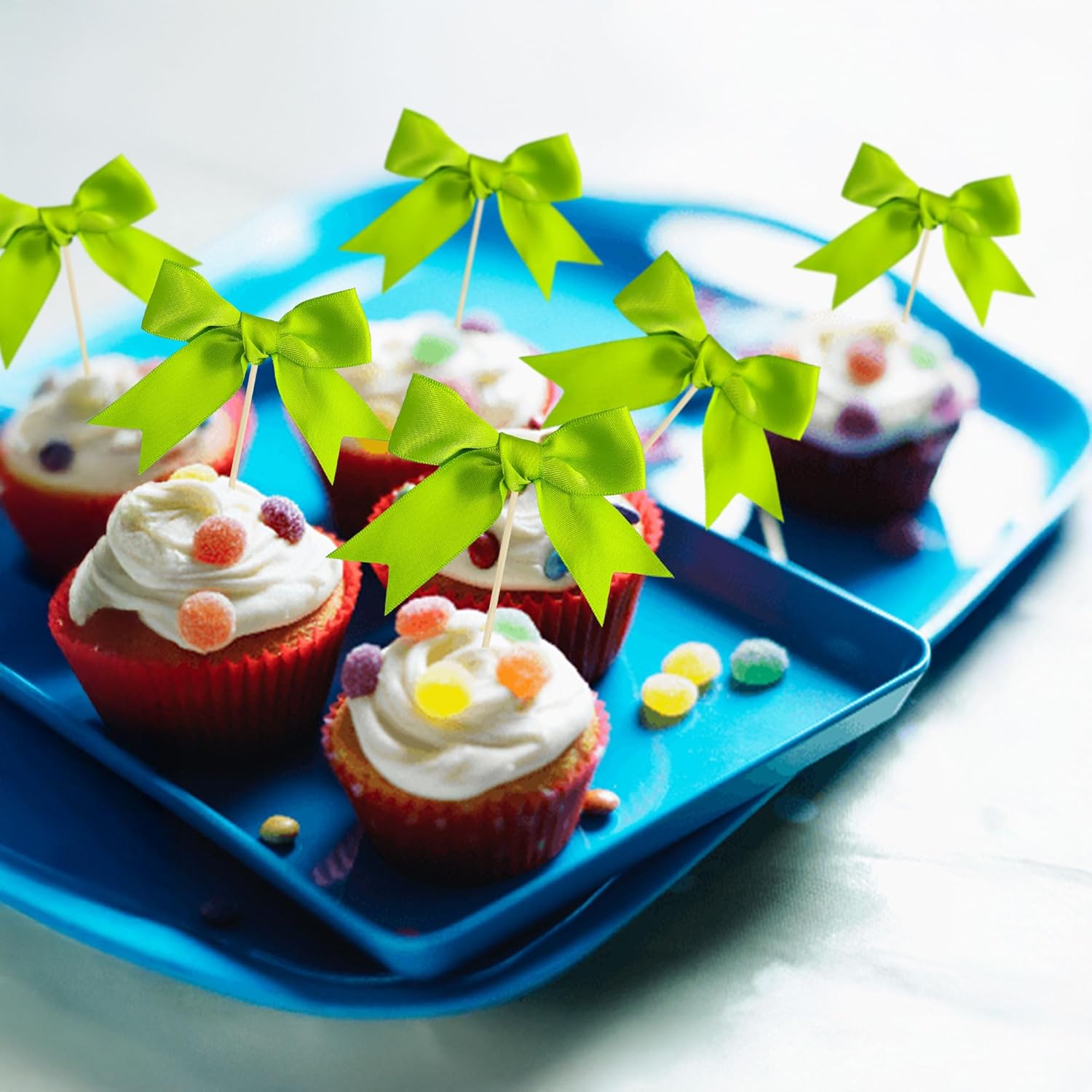 - 【Upgrade Quality】: These Bow Cupcake Toppers are made of high quality polyester satin ribbon. it is very so safe to be suitable for cakes, cookies, cakes, fruits, cookies, ice cream and other desserts.