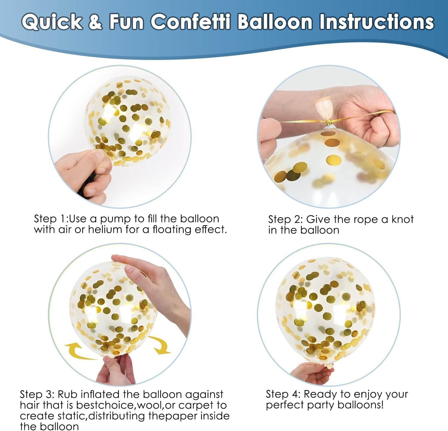 - ă Confetti BalloonăDue to the gold confetti is heavier than helium, the confetti moves in the direction of gravity. Rubbing the outer side of the balloon on the hair (the best way )or silk, wool, will help the confetti stick to the balloon. A balloon pump is strongly recommended. This will make the balloons look more beautiful.