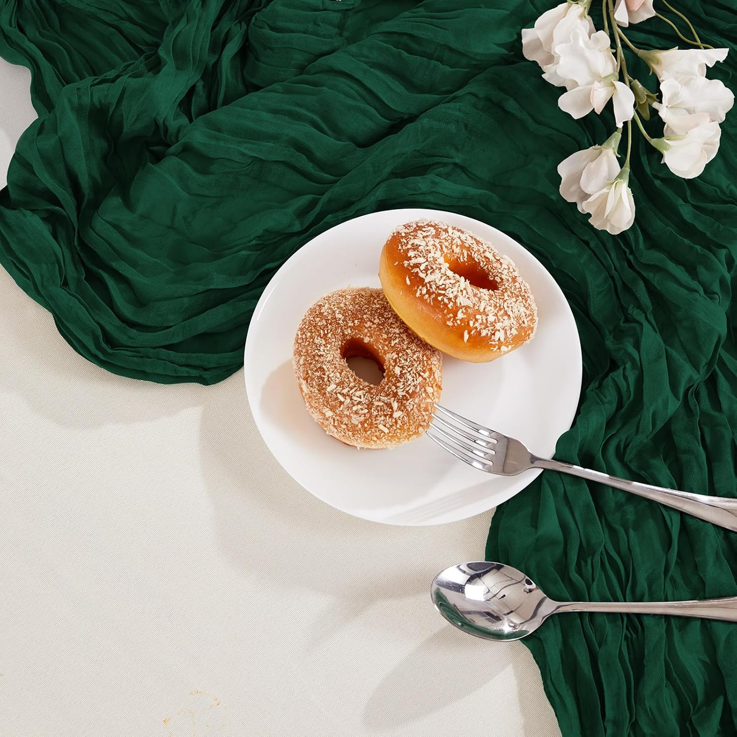 - PACKAGE INCLUDED: You will receive 6 pieces of emerald green cheesecloth table runners. Elegant and beautiful design, exquisite workmanship. Product size: Each boho table runner is 35 x 120 inches. Enough to cover rectangles and round tables, as well as long tables that are stitched together. It can even be used to belt chairs decorate napkins, background curtains. Round or square tables for 8-10 people, perfect for romantic and elegant party events