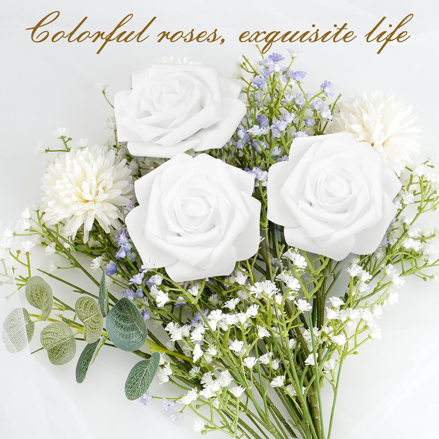 BLEUM CADE 16Pcs Artificial Flowers Fake Roses with Stems, White Boxed Foam Roses for DIY Bouquets Centerpieces Wedding Party Arrangement Bridal Shower Decor