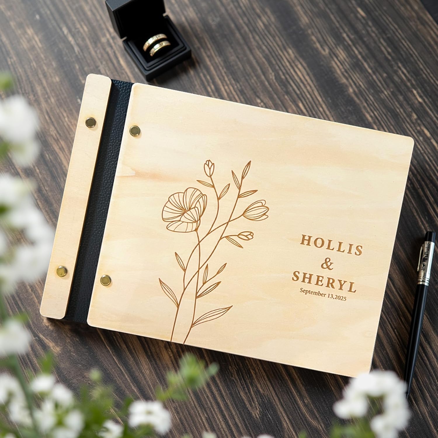 NBE Personalized Wooden Guest Book - Custom Wedding Sign-In Book with Burgundy Spine - Rustic Photo Album for Messages & Polaroids - Couples Keepsake Memory Gift (8.5x11.5 Inches)