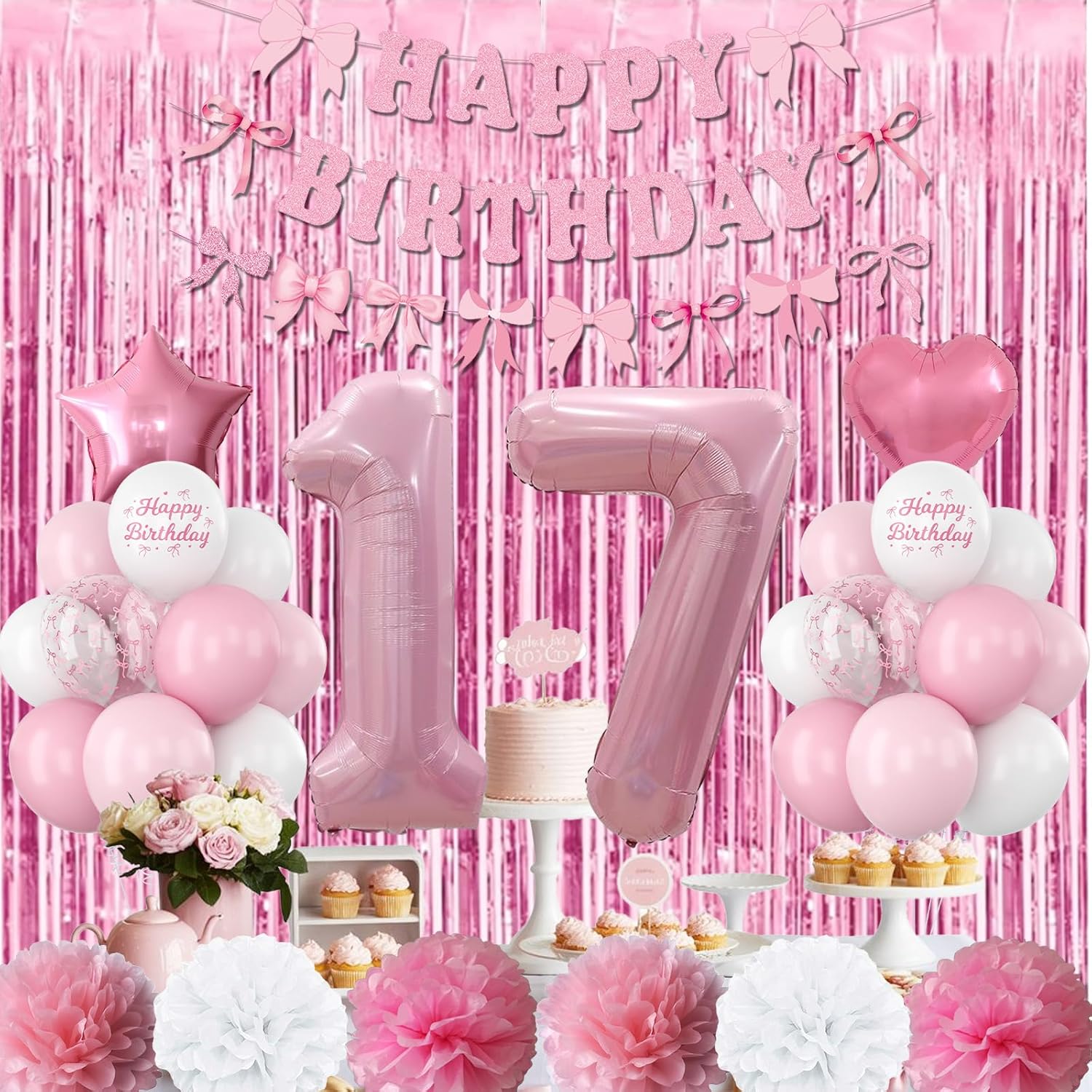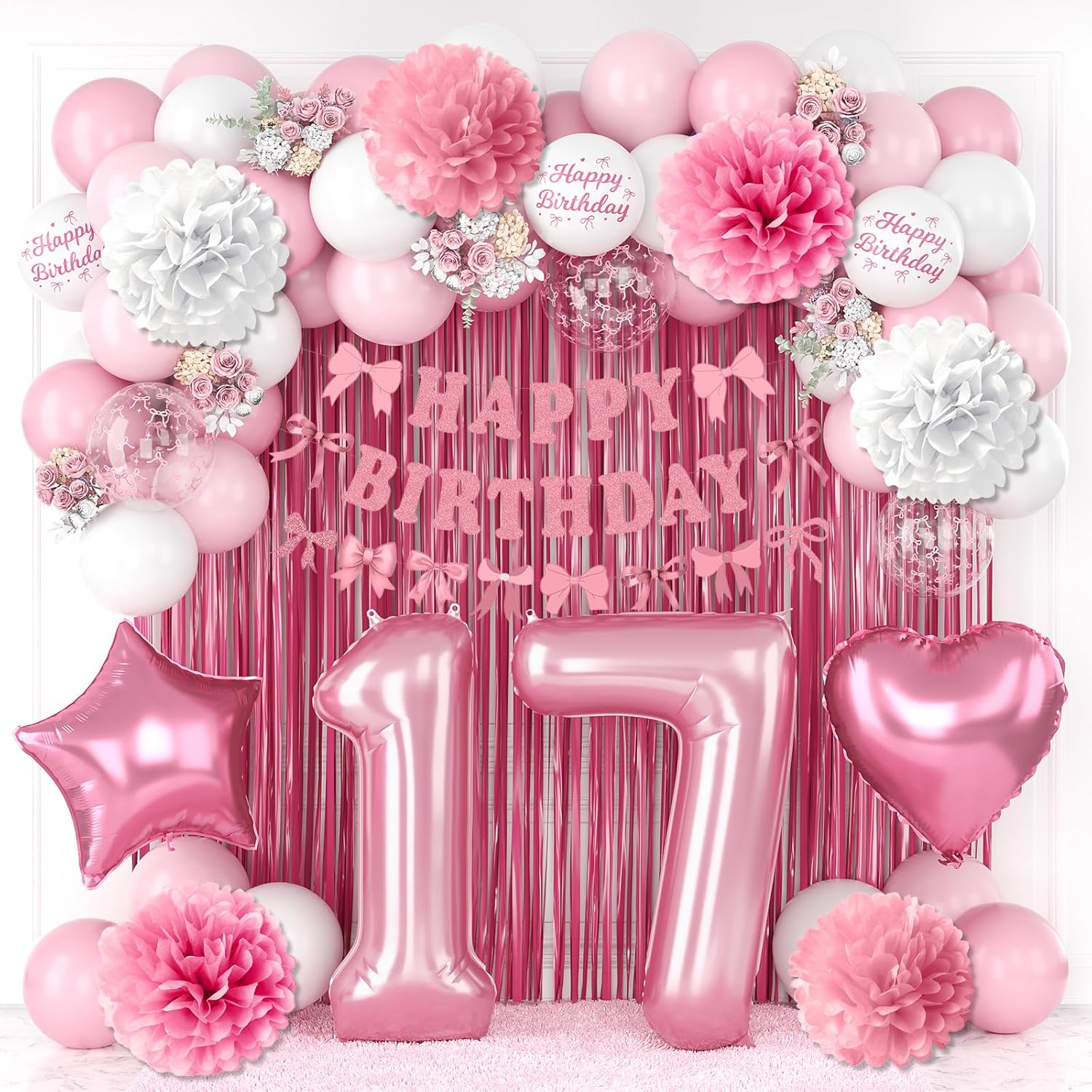 - PACKAGE INCLUDES: 1pc pearl pink number 17 balloon, 1pc bow happy birthday banner, 2pcs pink paper pom poms, 2pcs light pink paper pom poms, 2pcs white paper pom poms, 1pc pink curtain, 1pc light pink star foil balloons, 1pc light pink heart foil balloons,6pcs light pink balloons, 6pcs pastel pink balloons, 4pcs white balloons, 2pcs birthday printed balloons, 2pcs bow clear balloons, 1pc ribbon