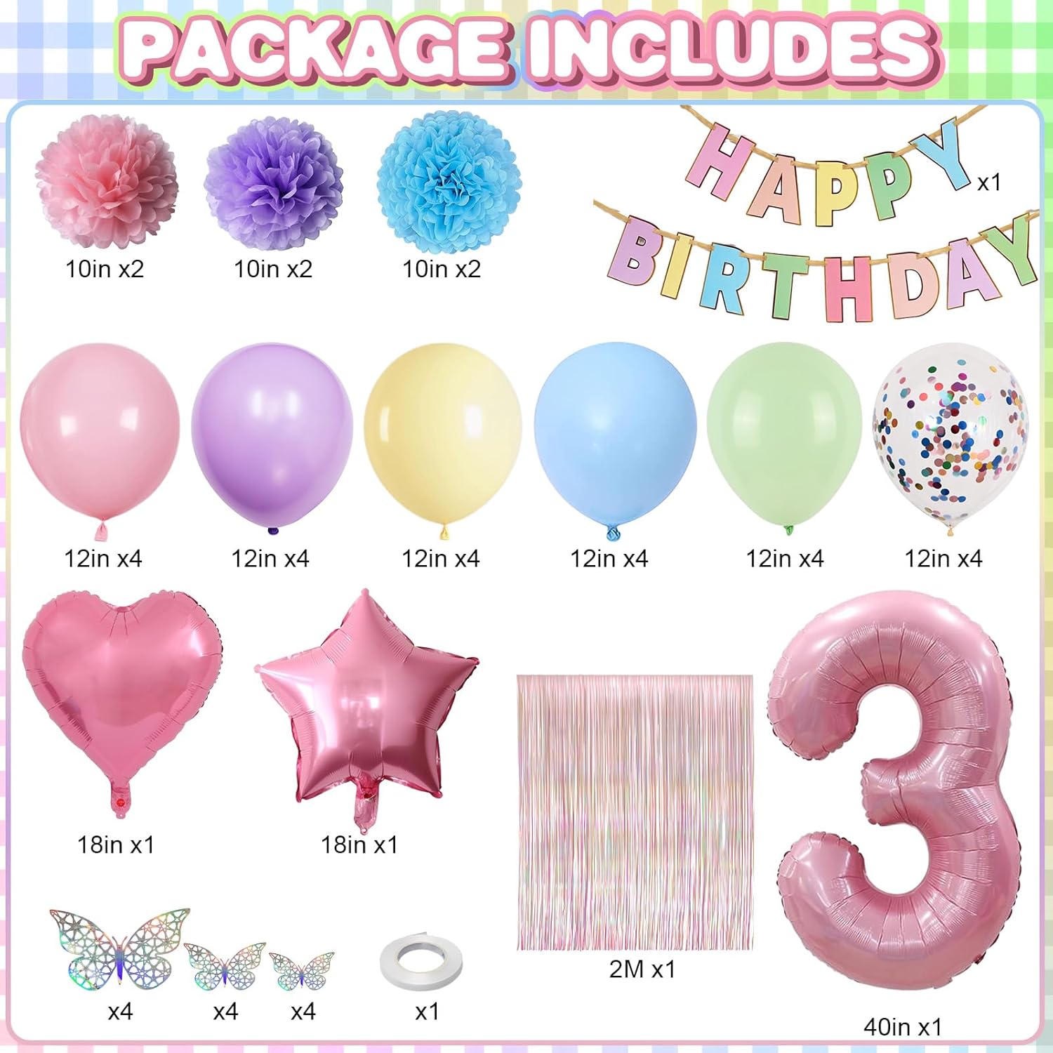 - PACKAGE INCLUDES: 1pc pearl pink number 3 balloon, 1pc happy birthday banner, 2pcs light pink paper pom poms, 2pcs light purple paper pom poms, 2pcs light blue paper pom poms, 1pc colorful white curtain, 1pc light pink star foil balloons, 1pc light pink heart foil balloons, 4pcs pastel purple balloons, 4pcs pastel pink balloons, 4pcs pastel blue balloons, 4pcs pastel green balloons, 4pcs pastel yellow balloons, 4pcs colorful confetti balloons, 1pc butterfly stickers set, 1pc ribbon