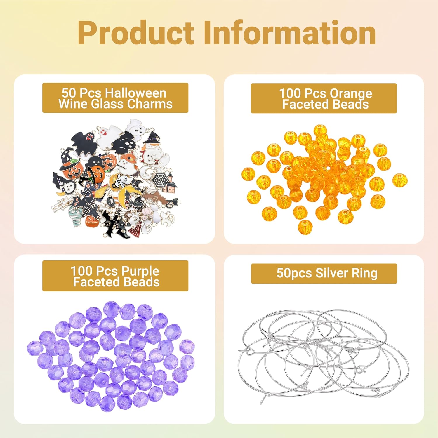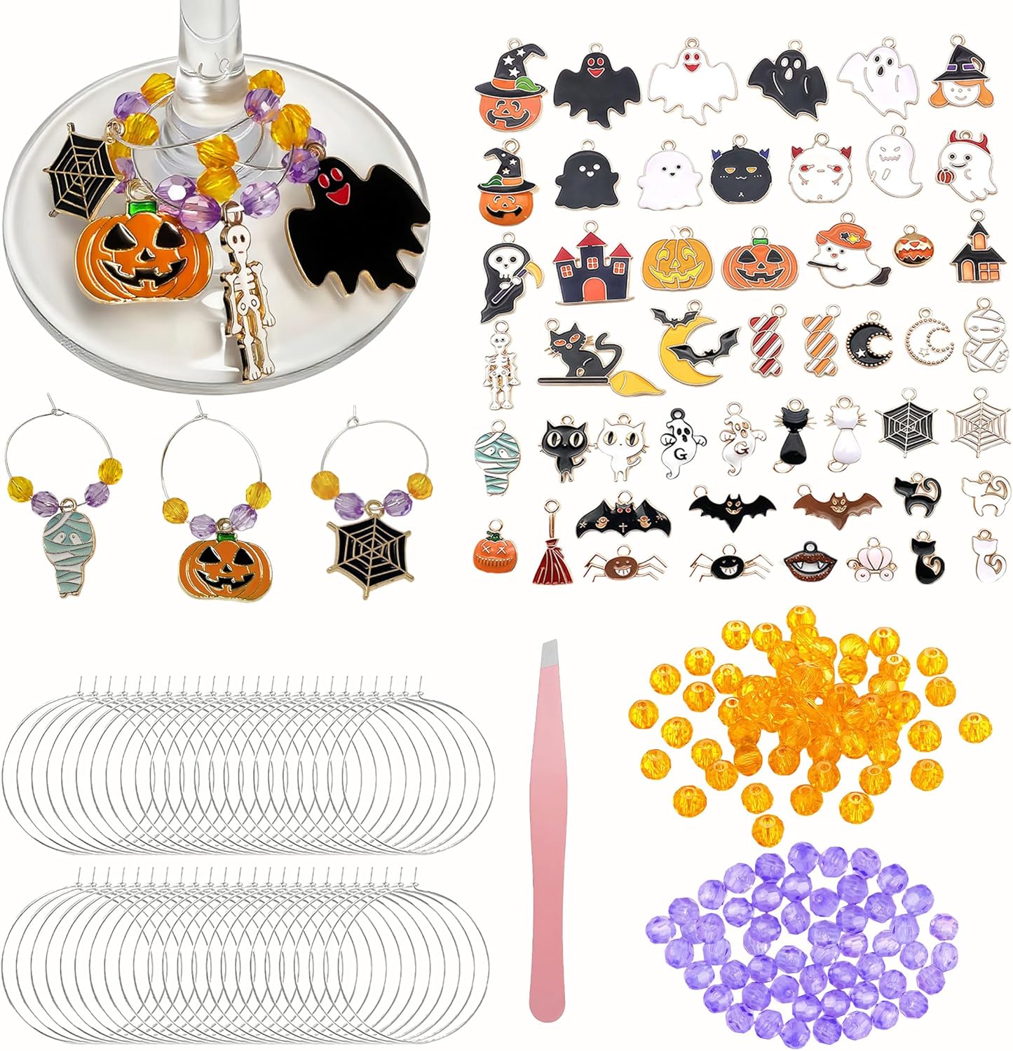 - HALLOWEEN WINE GLASS CHARMS KIT: Host the ultimate haunted party with this all-in-one DIY set! You'll receive 50 silver-toned wine charm rings, 50 unique Halloween alloy charms, 100 pumpkin-orange faceted beads, and 100 mystical-purple faceted beads. This massive kit ensures every guest can easily identify their glass, adding a fun, interactive element to your spooky celebration.