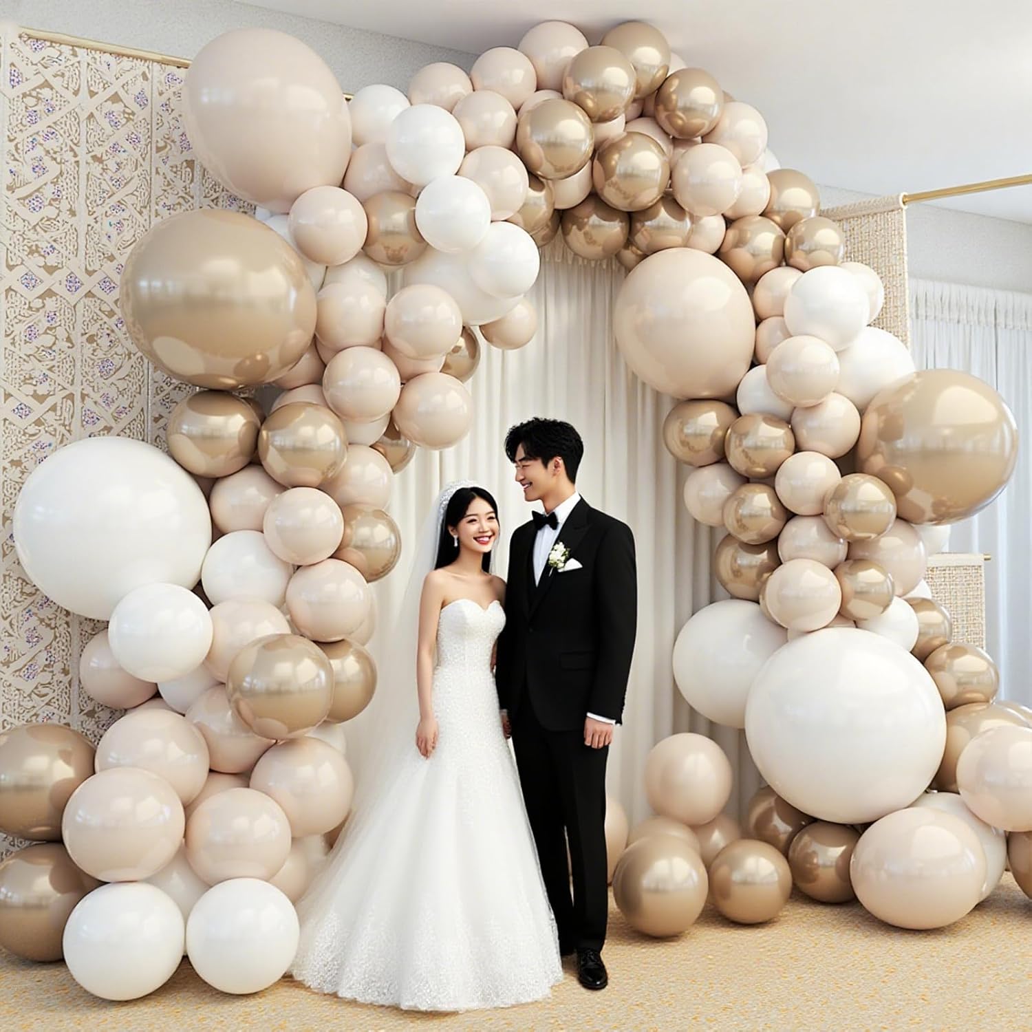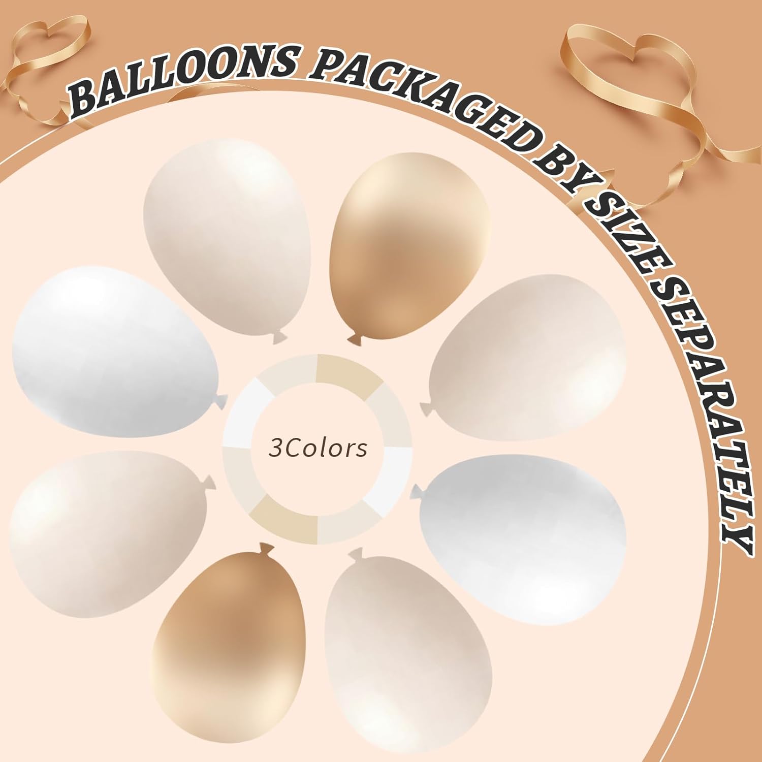 - Package List : balloon arch kit includes 18" Sand White/White/Champagne Gold balloons(12 pcs), 12" Sand White/White/Champagne Gold balloons(100 pcs), 10"Sand White/White/Champagne Gold balloons(100 pcs), 5" Sand White/White/Champagne Gold balloons(100pcs),glue dotsx200, ribbonx2, decorative stripx2. plenty in quantity.