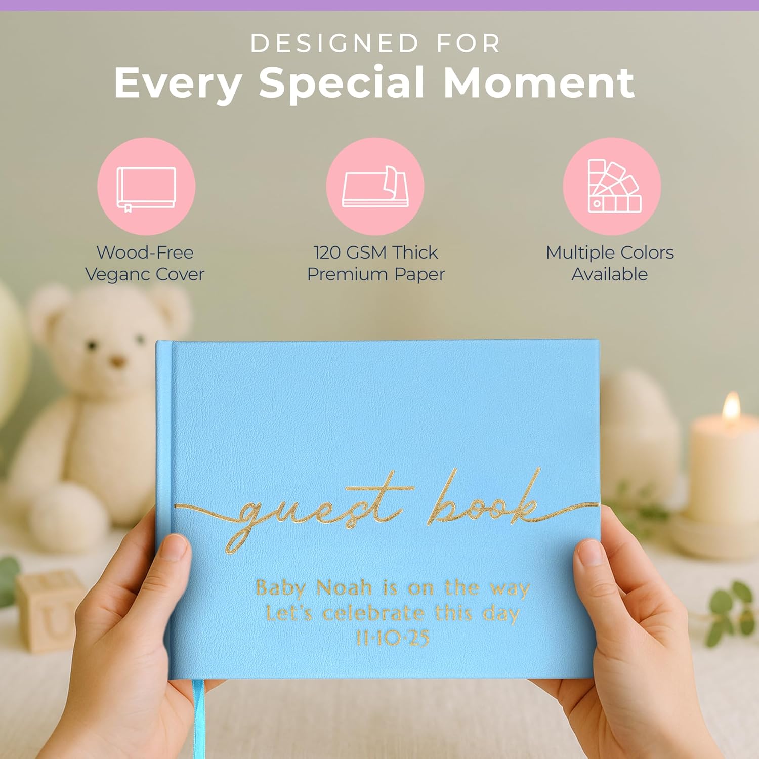 Promot Personalized Guestbook for Party (Baby Blue) - 110 Lined Pages in Wood-Free Vegan Leather Hard Cover - Wedding Guest Book Sign in and Photos, Baby Shower, Birthday or Graduation