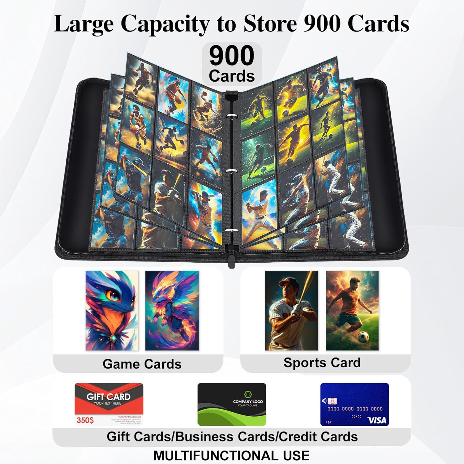 Trading Card Binder 9 Pocket with Display Window, 900 Cards Capacity Card Binder, Waterproof PU Leather Photocard Baseball Card Binder for MTG, TCG, Sports Cards, Black w/Clear Display Window