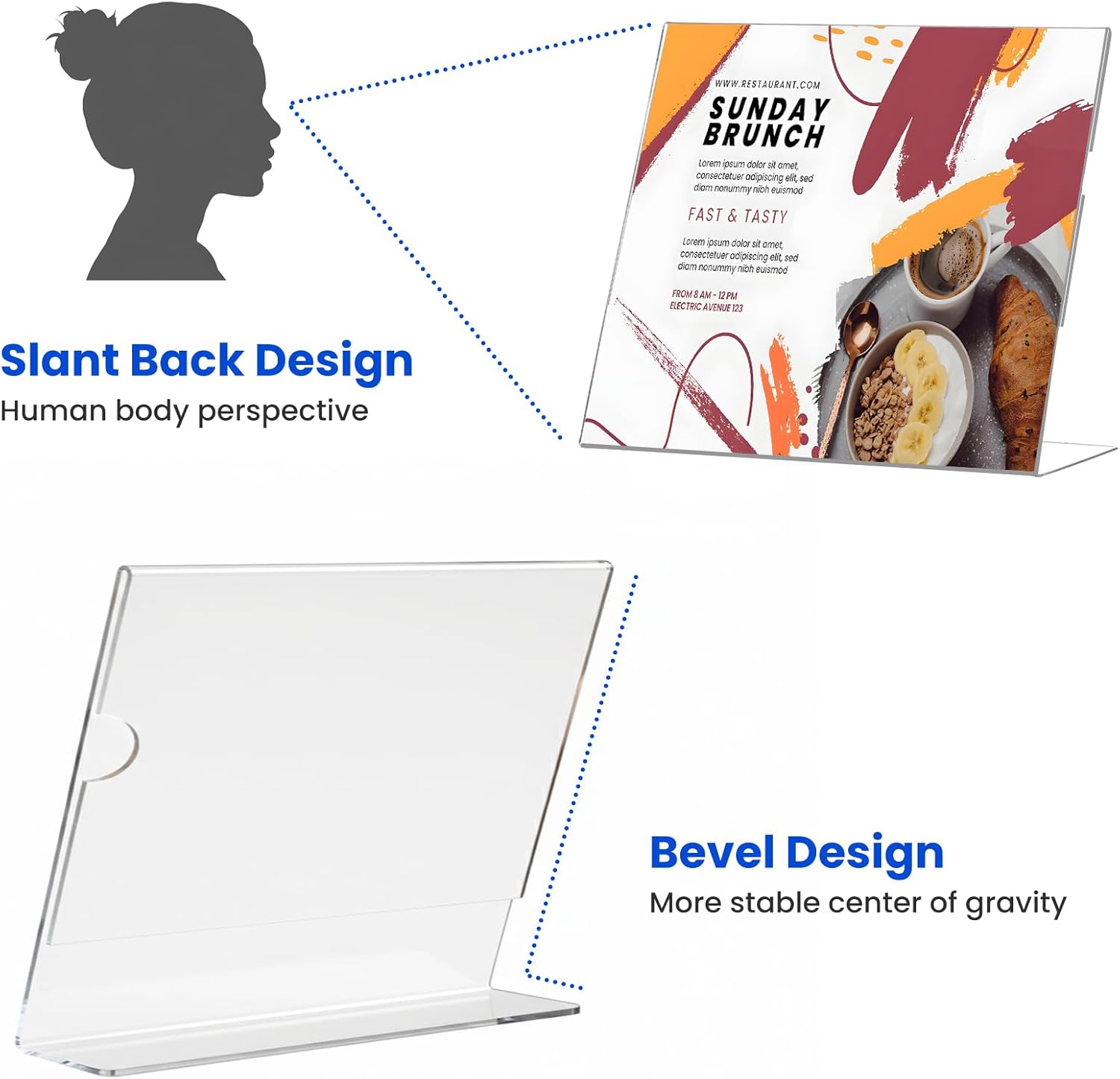 - 【SLANT SIGN STAND】Acrylic sign holder features a stable slant-back design for optimal viewing angles, making it perfect for showcasing photos and advertisements with ease. Papers can be effortlessly replaced from either side. PLEASE NOTE the front and back are covered with protective film, please peel them off before use