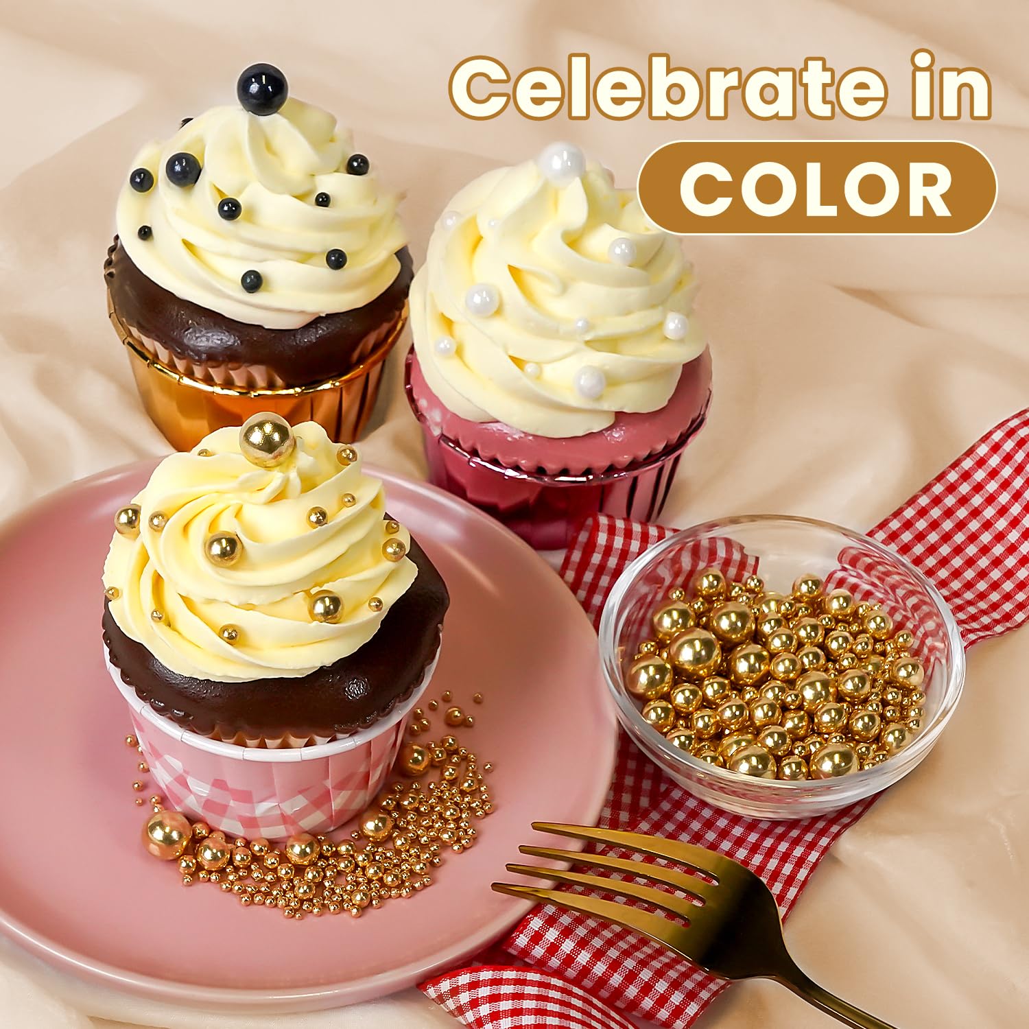 - Perfect Decoration: Gold sugar candy pearls sprinkles come with 5 different sizes. Gold edible sprinkles can add a sense of decoration to cakes,cupcake,cookies,Ice cream and other foods, making it more beautiful and unique.The gold sprinkles are bulk. 180g shaker bottle decorates 6-8 large cakes.