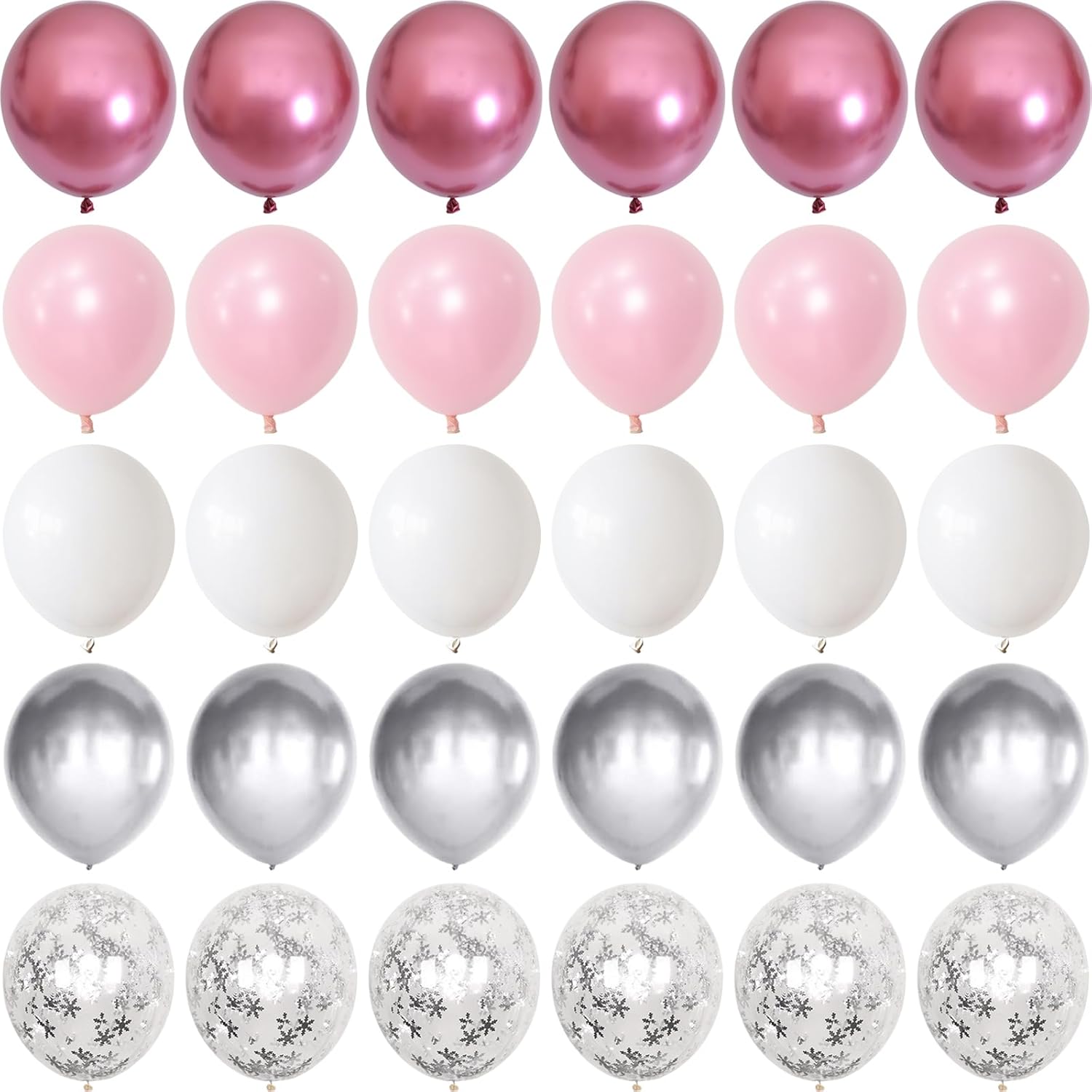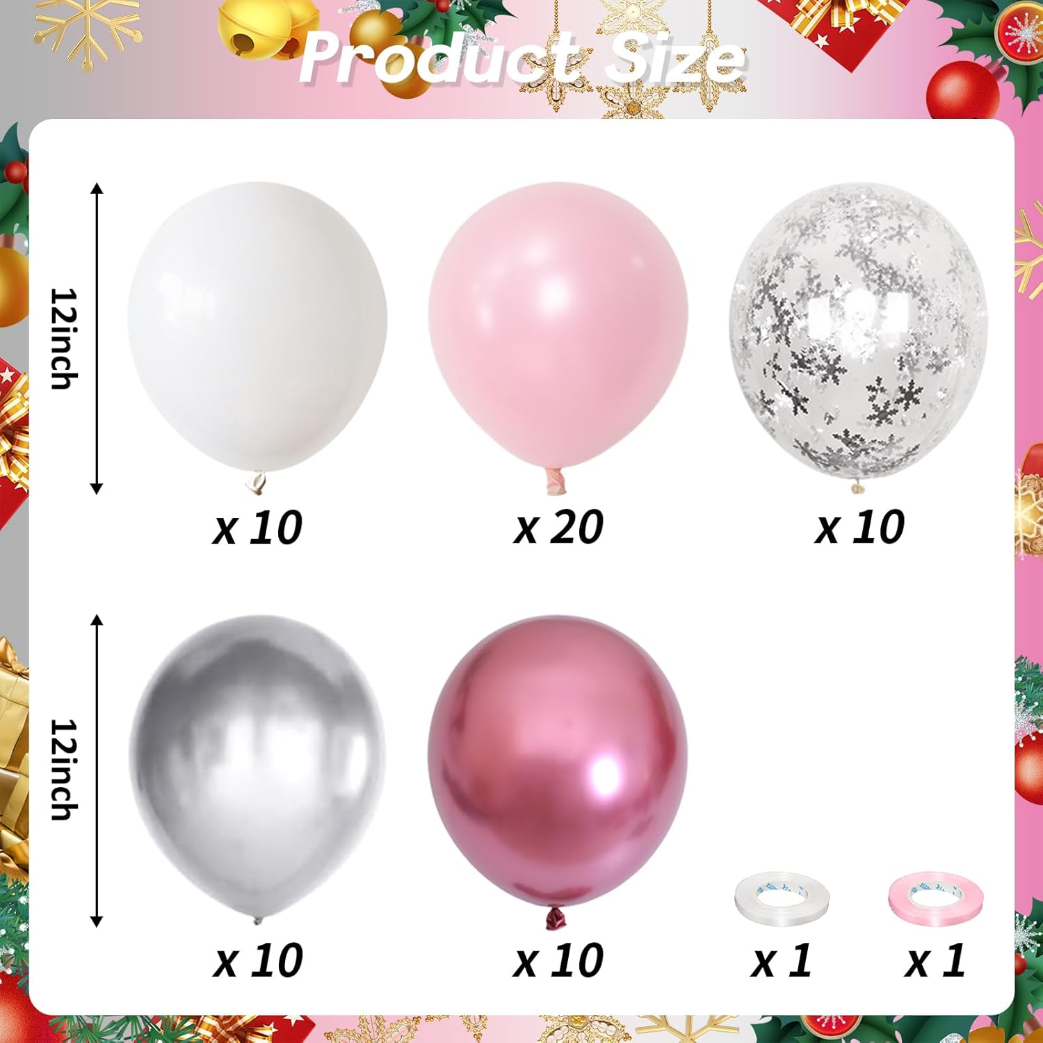 - Party Balloons Set: The pink winter wonderland balloons set have 60pcs 12inch helium balloons, include 20pcs pearl white & pink double stuffed balloons, 10pcs white balloons, 10pcs metallic chrome silver balloons, 10pcs metallic chrome hot pink balloons, 10pcs snowflakes confetti balloons, and balloon ribbon(white *1, pink *1).