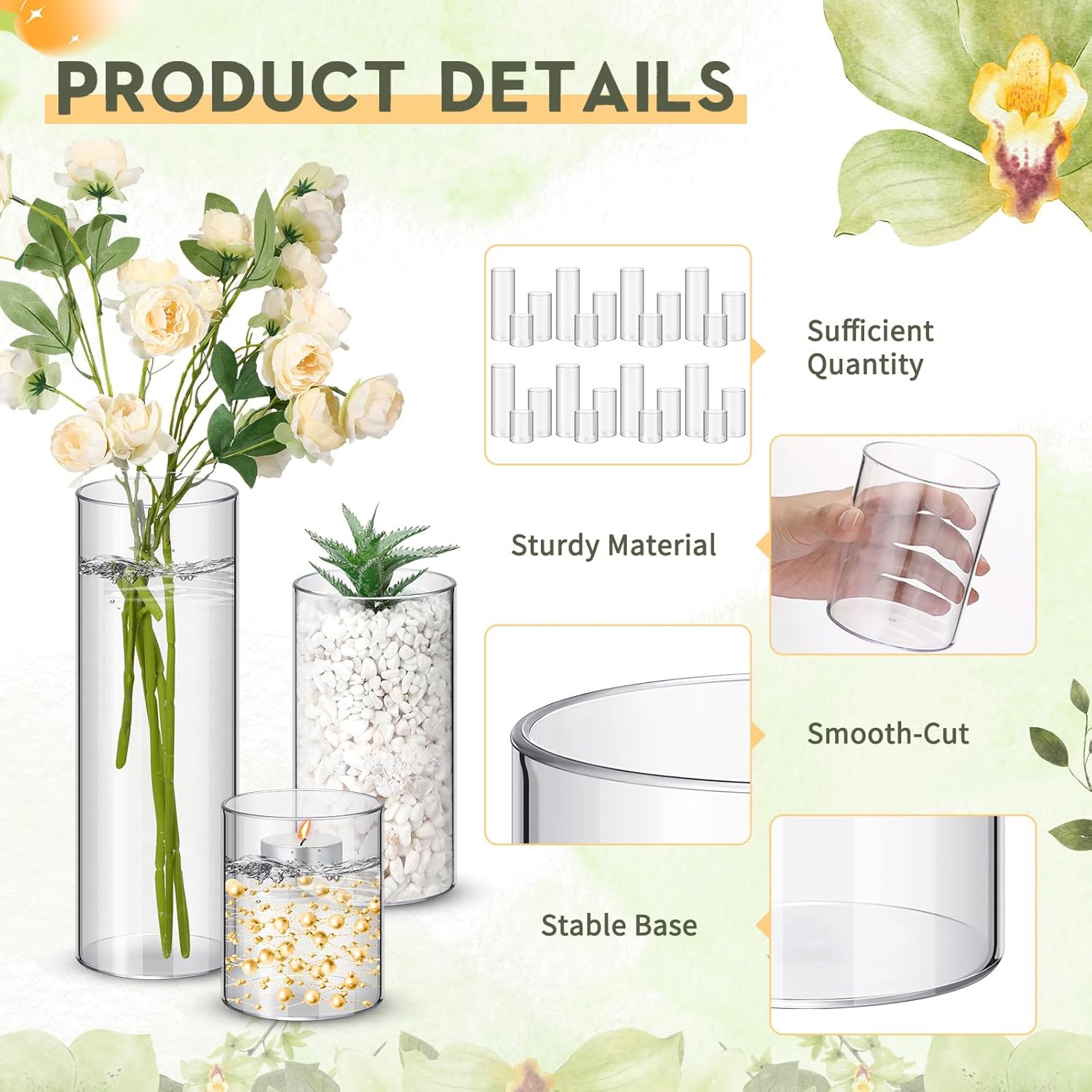 - Abundant Quantity: with 12 clear cylinder vases included in the package, you'll have an ample supply for your floral arrangements or decorative displays; Whether you're organizing a large event or simply enjoy regularly refreshing your room decor, this set provides the quantity you need to effortlessly adorn multiple spaces