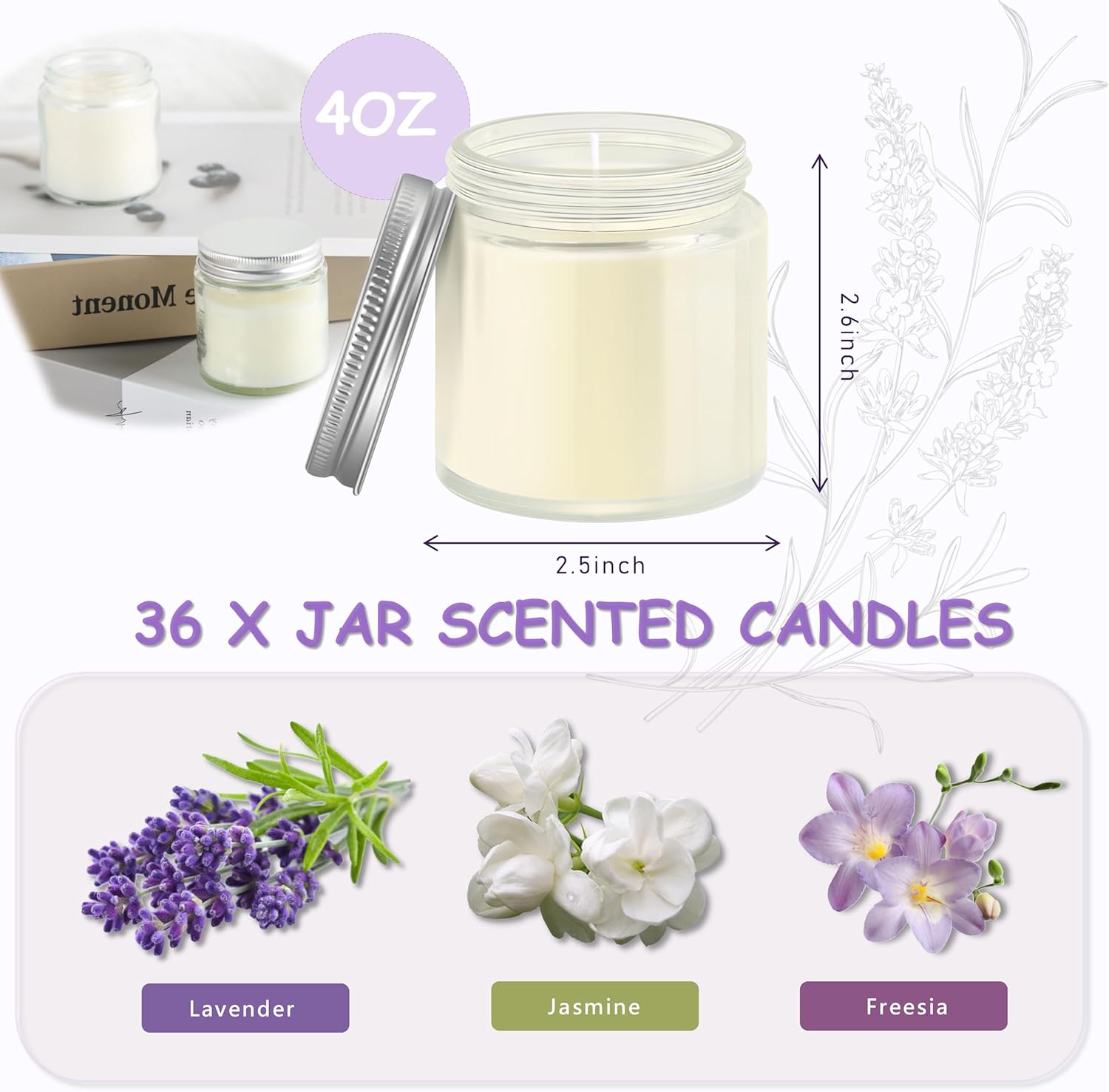- Product Contents: 36 candles (4 oz each) in glass jars with silver lids, including 12 lavender, 12 freesia, and 12 jasmine-scented candles.