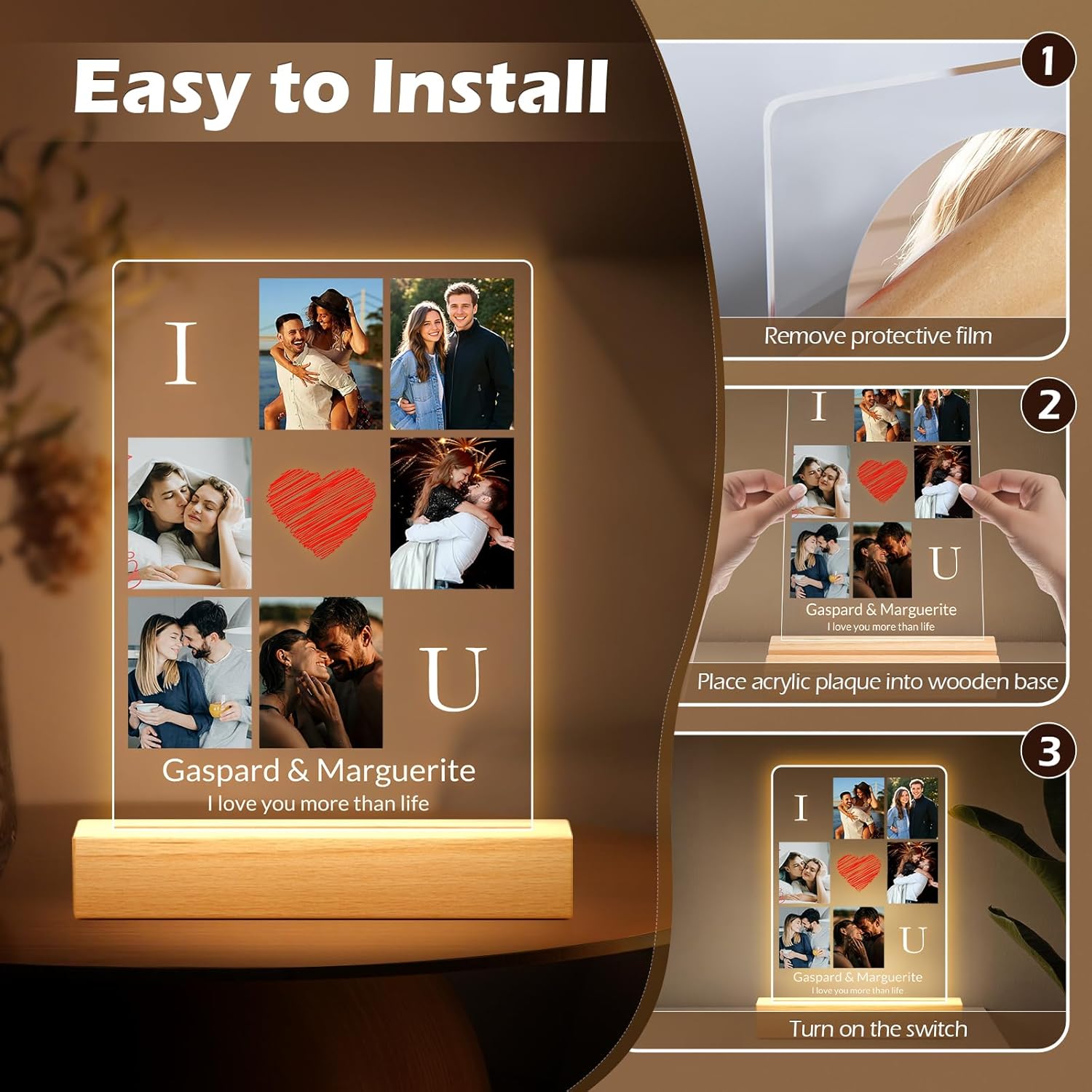 - Personalized Photo Frame with Night Light: Simply upload your favorite photos and add custom text to create a unique acrylic photo plaque with an integrated night light. This artistic display beautifully showcases your precious memories, adding a touch of romance and meaning to any space.
