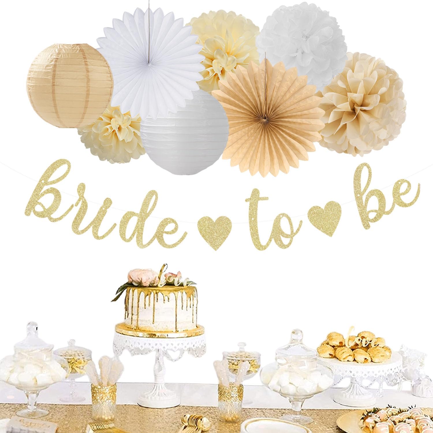- ăPackage ContentăChampagne gold white fall bridal shower party decorations contains: 1 pcs bride to be banner, 1 pcs circle dots paper banner, 2 pcs hanging paper lanterns, 4 pcs tissue paper pom poms, 2 pcs paper fans, 6 paper swirls and 15 pcs tassel garland, total 31 pcs in 8 10 12 inch and champagne gold white peach color.