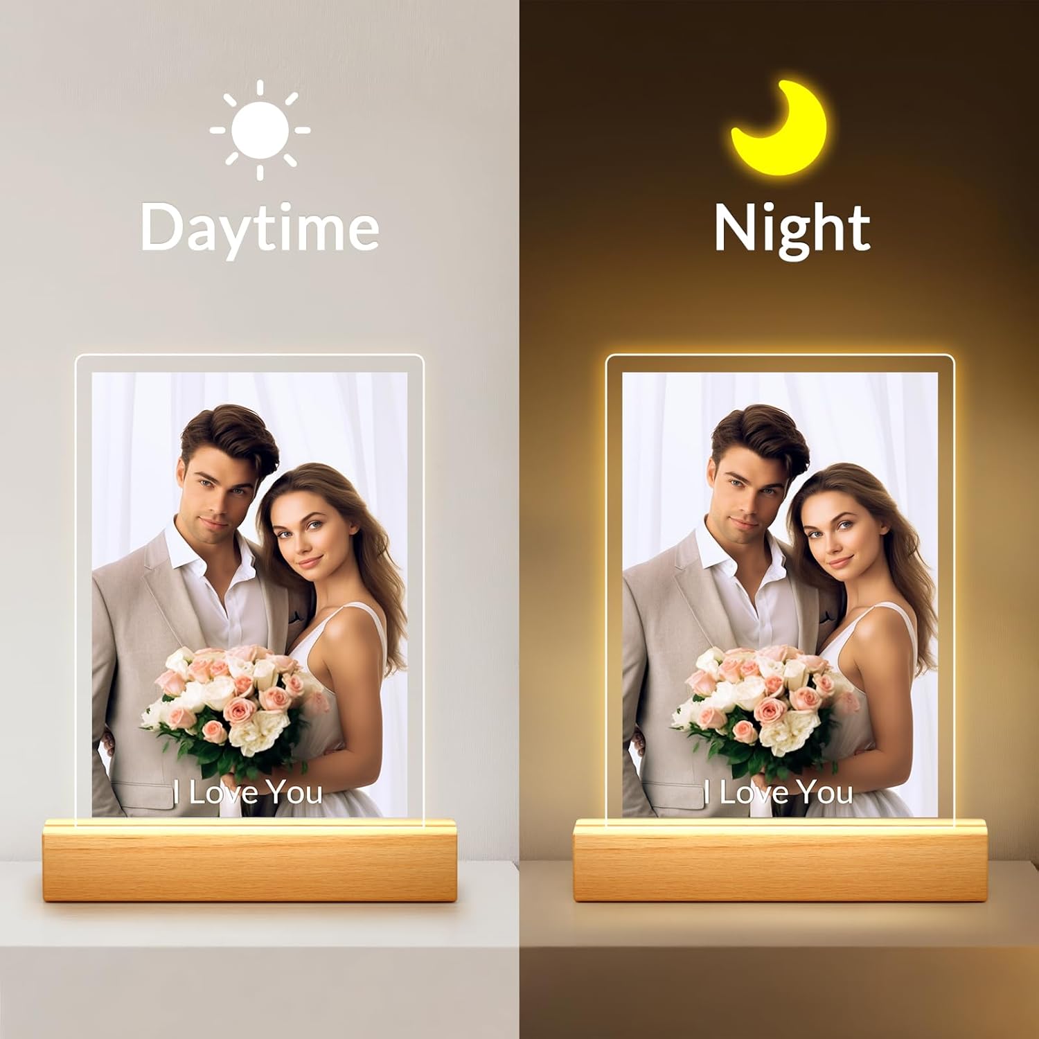 - Multiple Night Light Options: The custom acrylic photo frame’s wooden base is available in three lighting styles: warm light, 3-color light, and 7-color light. These options let you create the perfect ambiance for any occasion, adding romantic warmth to your home decor.