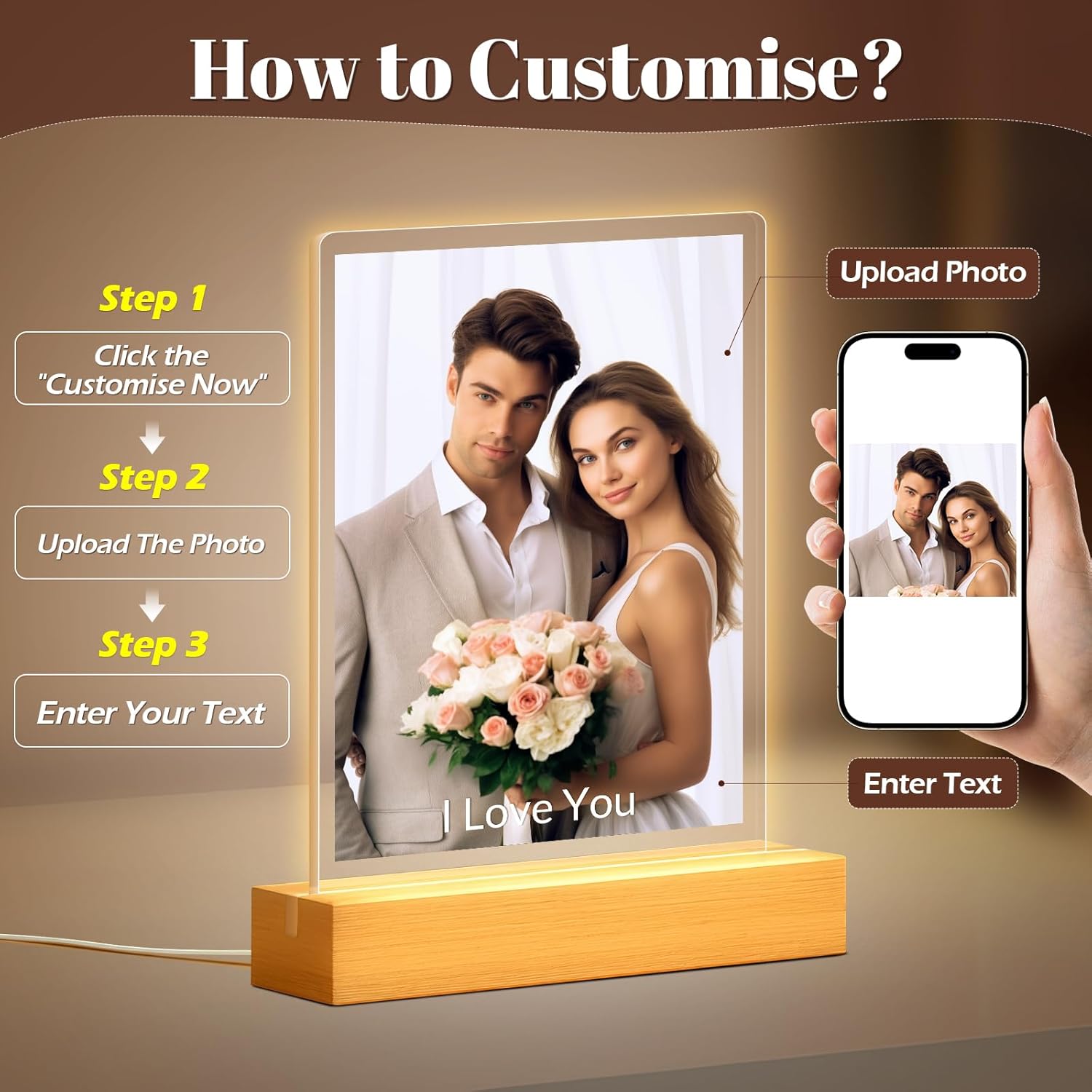 - Personalized Photo Frame with Night Light: Simply upload your favorite photos and add custom text to create a unique acrylic photo plaque with an integrated night light. This artistic display beautifully showcases your precious memories, adding a touch of romance and meaning to any space.
