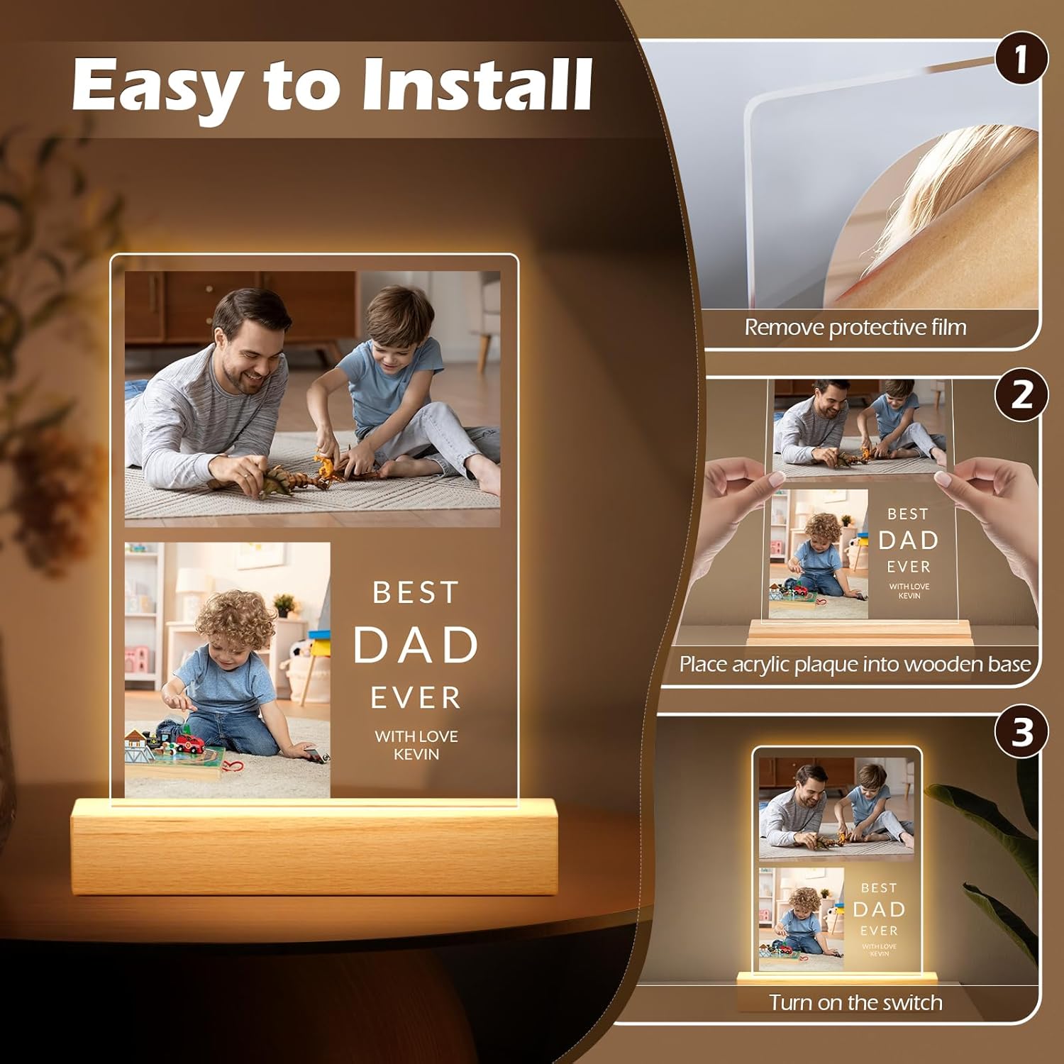 - Multiple Night Light Options: The custom acrylic photo frame’s wooden base is available in three lighting styles: warm light, 3-color light, and 7-color light. These options let you create the perfect ambiance for any occasion, adding romantic warmth to your home decor.