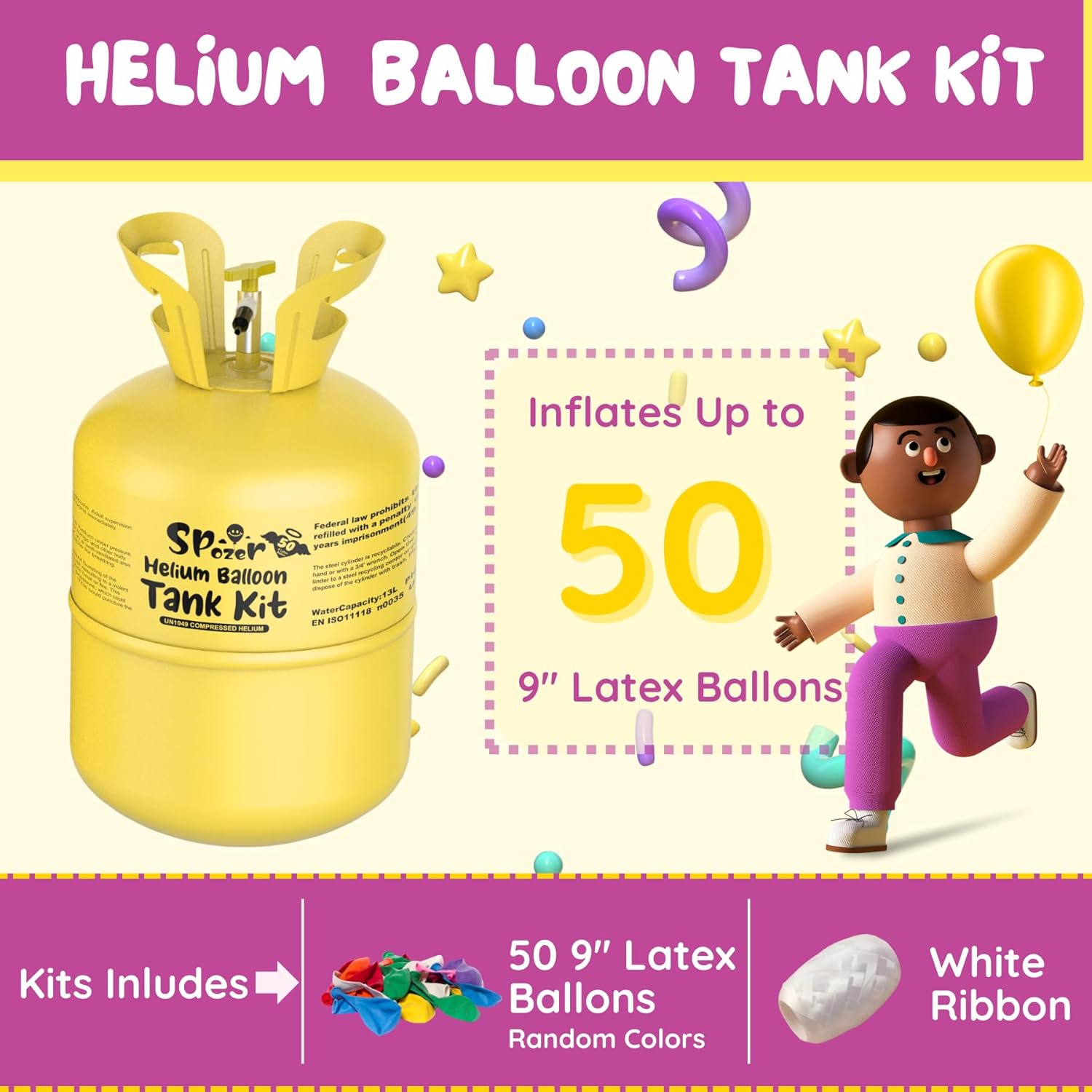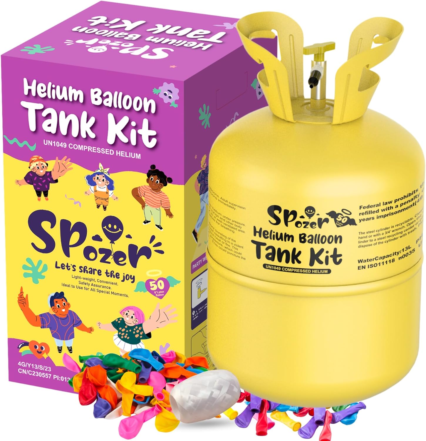 - 【High Purity & Safe】Each Spozer helium tank for balloons at home is filled with 99.99% high-purity helium—non-flammable, non-toxic, and safe for family use. One 13L tank can inflate up to 50 nine-inch latex balloons.