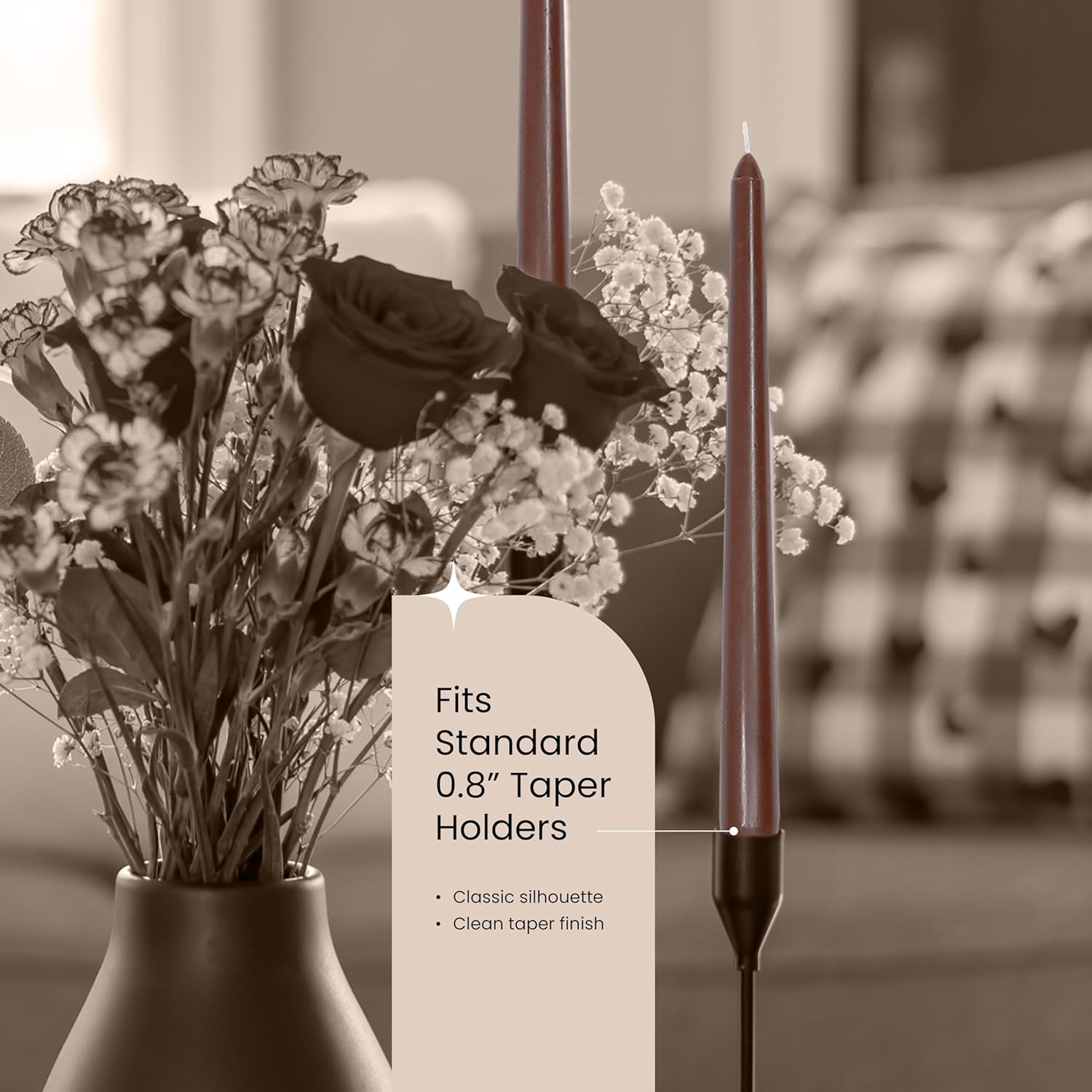 - Long-Burning Brown Tapered Candles – Each 10” taper burns up to 6 hours of fragrance-free light, ideal for rustic autumn dinners, Thanksgiving feasts, or farmhouse décor where earthy candlesticks add cozy charm.