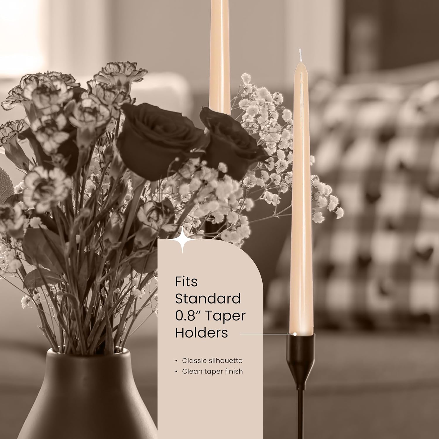 - Long-Burning Beige Tapered Candles – Each 10” tall taper burns for up to 6 hours unscented, offering versatile light for minimalist dining tables, modern weddings, or everyday meals where neutral candlesticks add warmth.