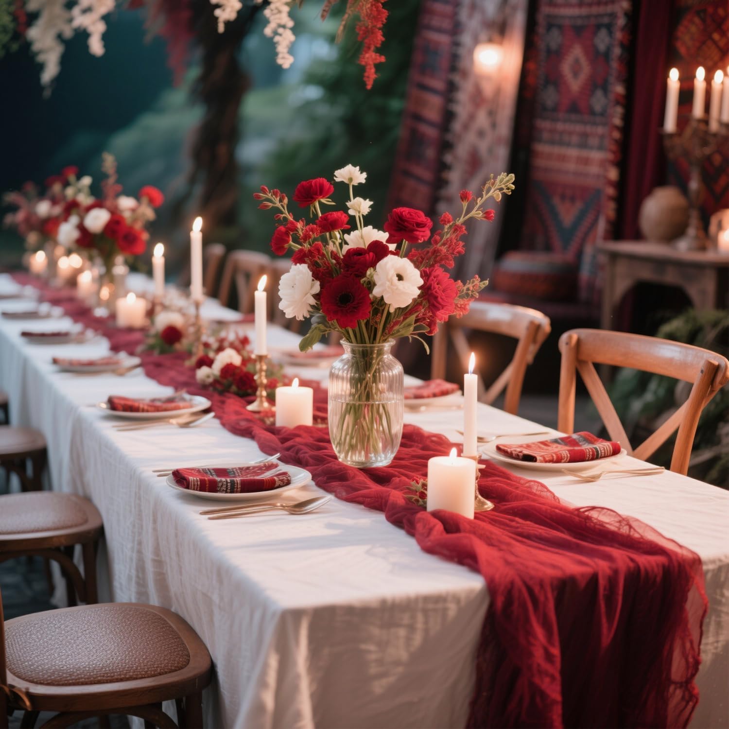 - đăSoft & Durable MaterialăMade of natural cheese gauze fabric, soft to touch, comfortable and long-lasting. Wrinkled design cheese cloth farbic, delicate edges and stitches, adopts seamless technique makes this red sheer table runner more graceful than traditional fabrics. The boho wedding table runner red is sheer, natural drape, lightweight and skin-friendly. Soft table linen with gorgeous finished edges drapes gracefully across your banquet table.