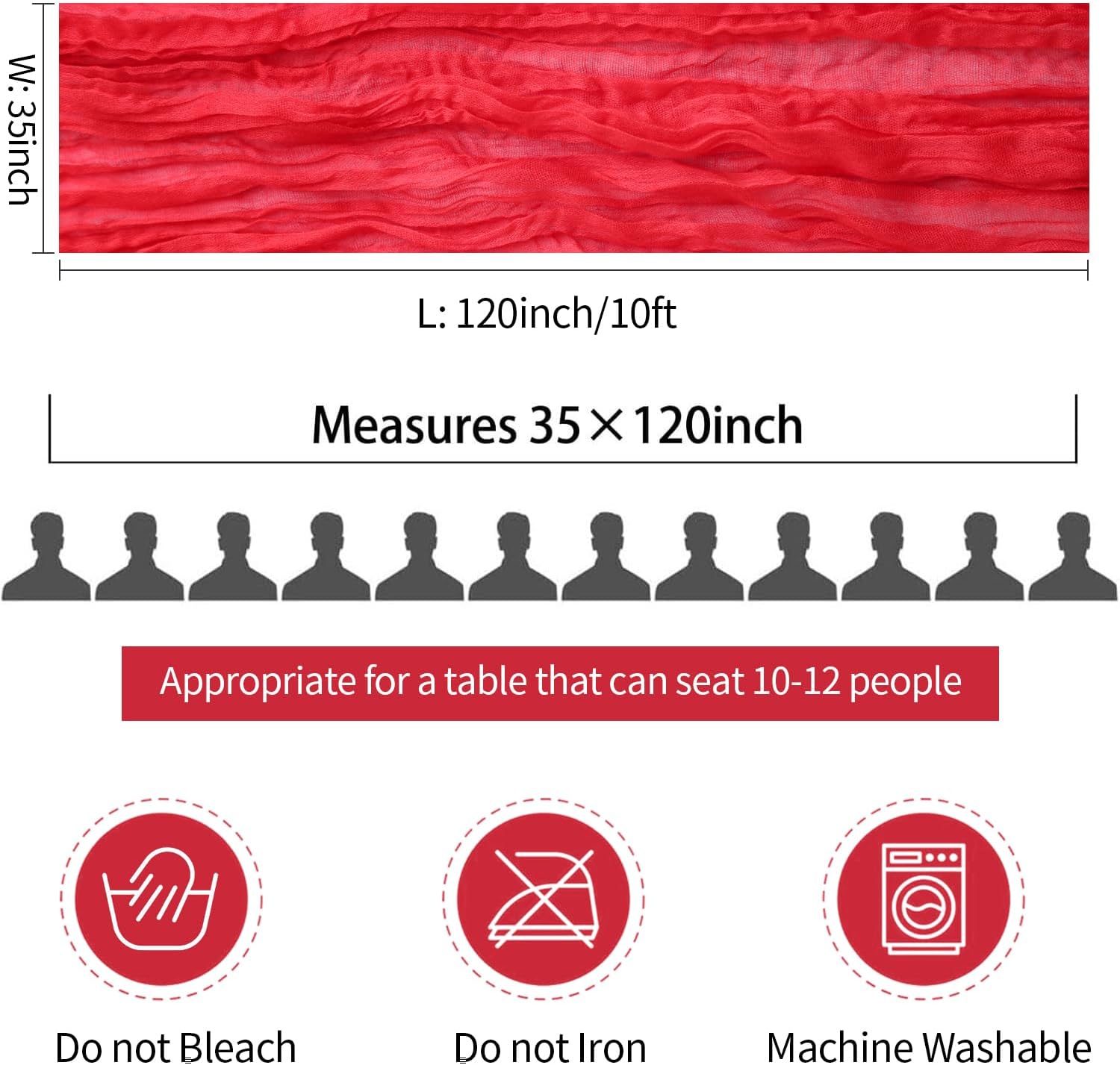 - đăVintage Red Table RunnersăYou will get 3 pieces 10ft length red cheesecloth table runners, enough quantity is suitable for wedding banquets and various parties, the size of each red gauze table runner is approximately 35 x 120 inches / 90 x 300 cm, which is large enough to cover rectangle and round tables, can also be spliced together for long tables. Even can also cut it yourself for DIY chair cover sashes or decorative napkins, backdrop draping or even gift wrapping.