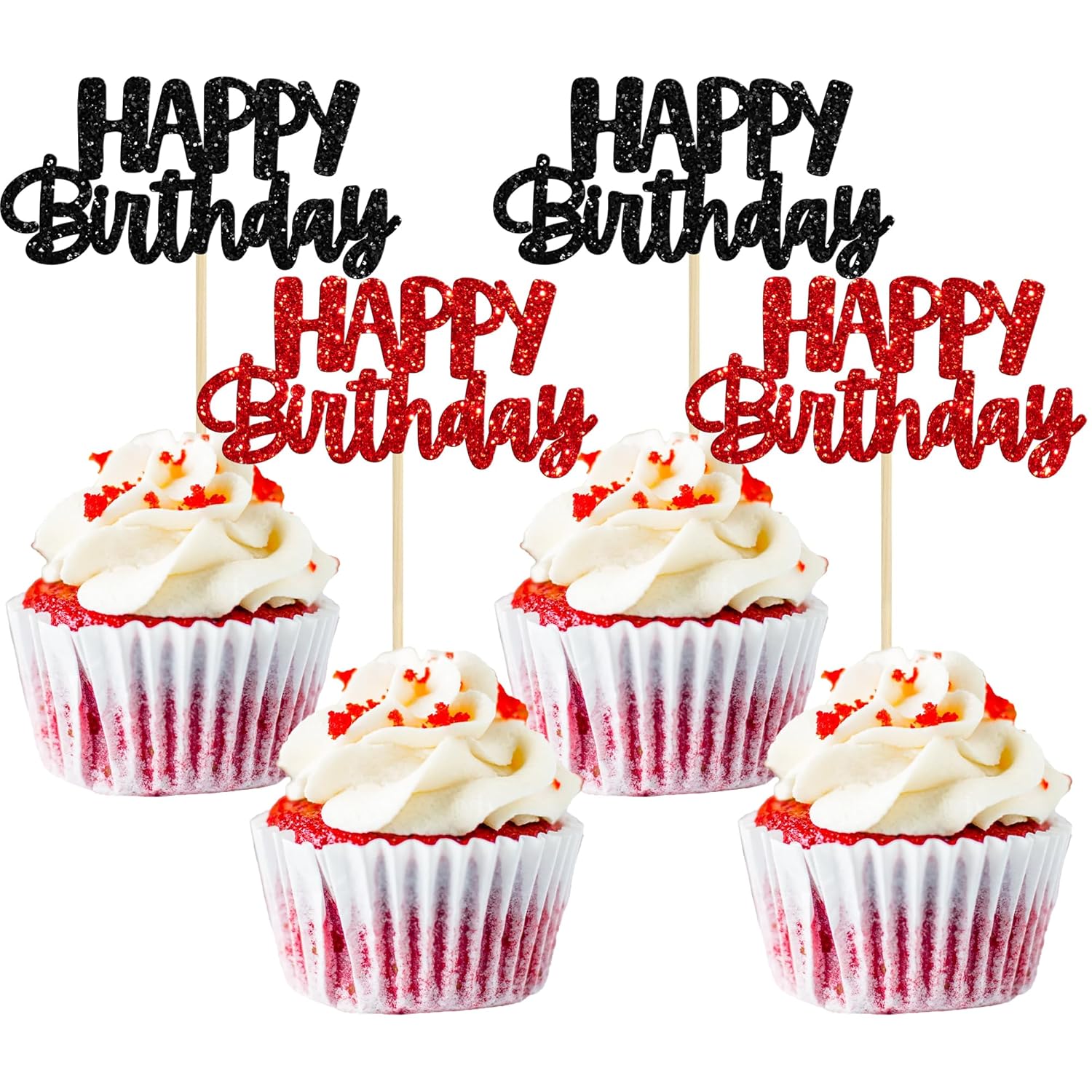 Gyufise 24Pcs Happy Birthday Cupcake Toppers Glitter Birthday Cupcake Food Picks for Celebrating Happy Halloween Theme Party Cake Decorations Supplies Black Red
