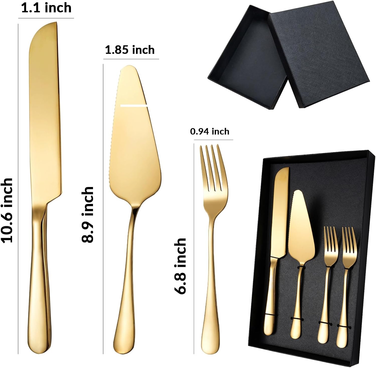 - Wedding Cake Cutting Set:This 4-piece silver cake cutting set comprises a cake knife measuring 9 inches in length and 0.9 inches in width, a cake server measuring 8.7 inches in length and 1.9 inches in width, and two cake forks each measuring 5.5 inches in length and 0.9 inches in width.