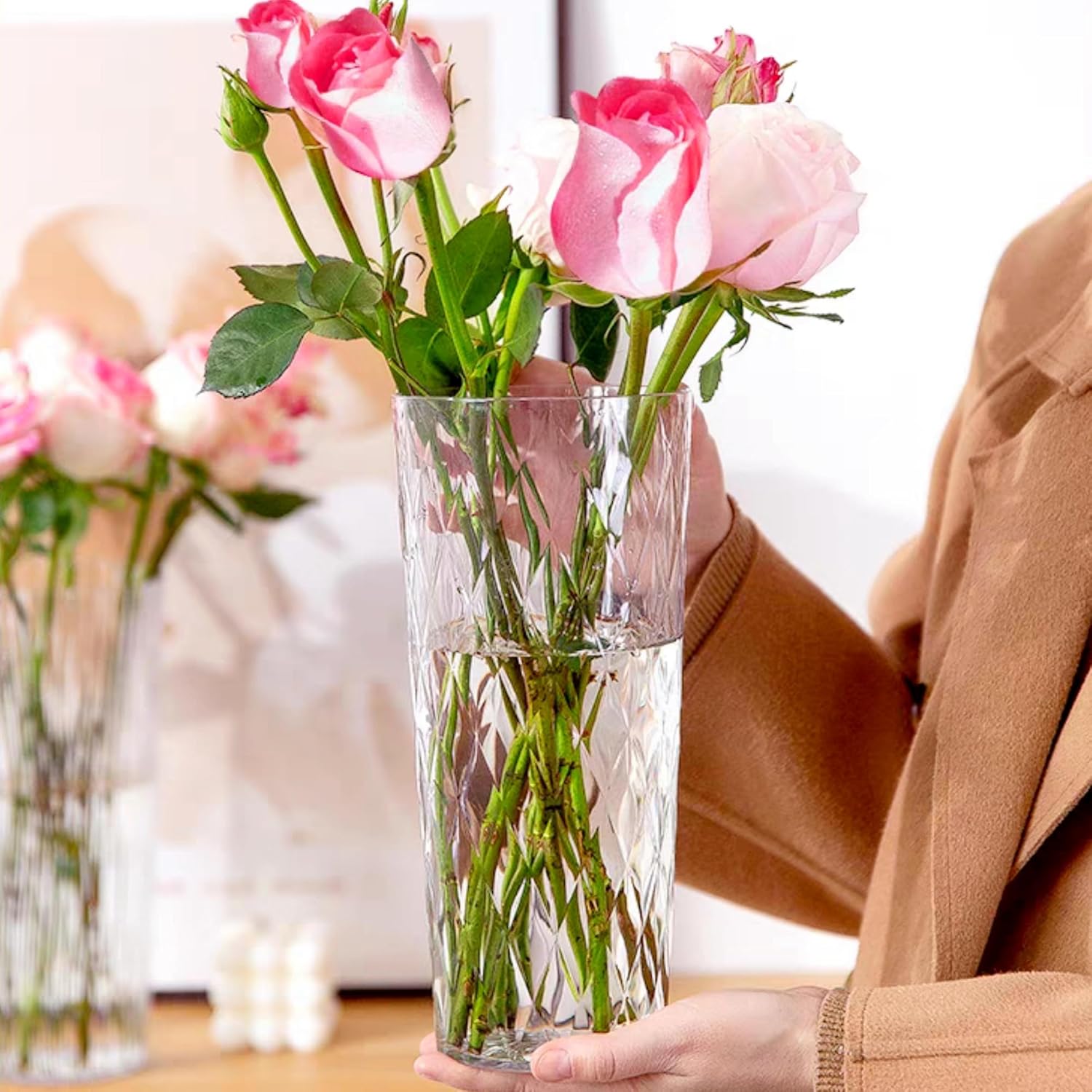 - đ·ăPerfect CenterpieceăThe crystal clear large cylindrical plastic vase makes a stunning centerpiece with its tall and elegant design. Whether you are planning a wedding, party, intimate dinner or grand event, combine them with your favorite flowers, candles or other decorative elements to create a focal point that will leave a lasting impression on your guests.