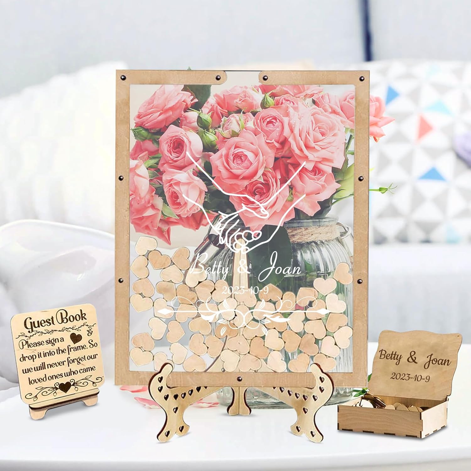 - Personalized Wedding Guest Book: This customizable wedding guest book allows for personalized names and dates. The couple can have their names and wedding date engraved on the book, transforming it into a special wedding keepsake. Guests write their names or well-wishes on heart-shaped wooden pieces before placing them inside the book. Each wooden piece carries the guest's heartfelt message, capturing a special moment from the couple's wedding day.