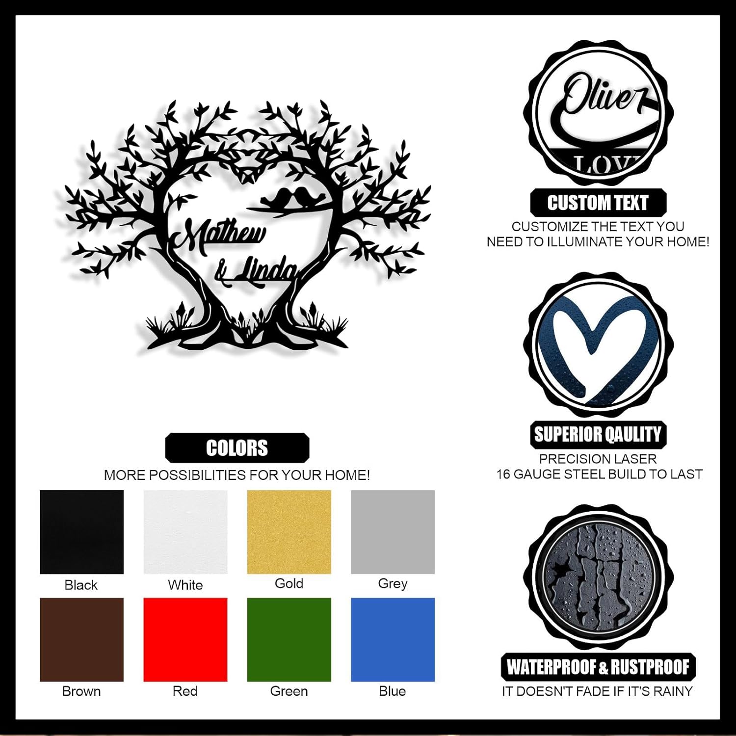 - Sturdy Material -- Our custom tree of life metal sign is crafted from sturdy 16 gauge steel with unique laser technology. The custom signs are powder coat finished. The surface is smooth, free of burrs, waterproof, anti-fading, can keep it use for years.