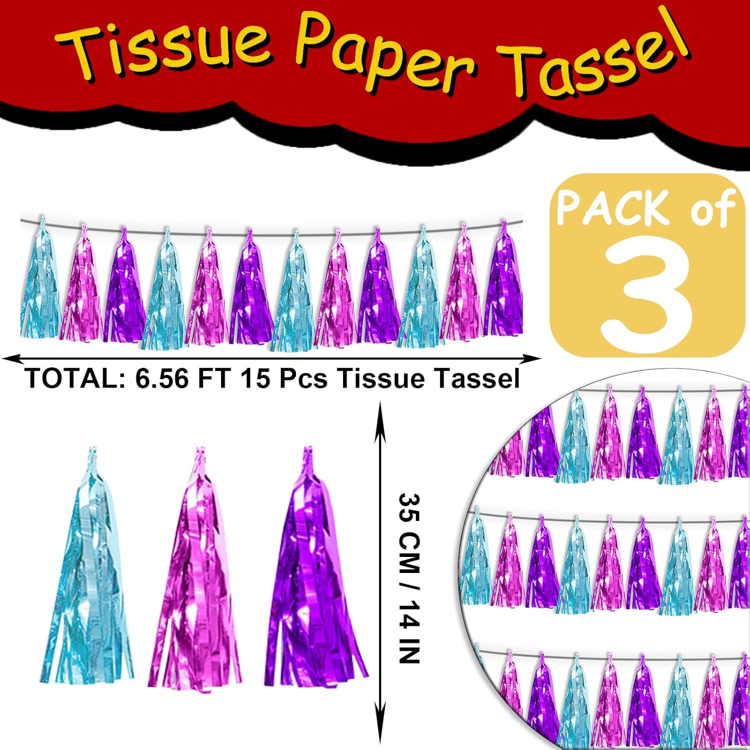 - 【Package Includes】The total length of the Lake Blue Purple-Hot Pink birthday tassels banner is 30 feet, divided into 3 strips, each 10 feet long. Each banner contains 15 tassels, and each tassel measures 14 inches, for birthday decorations many occasions uitable for Patriotic display, Homecoming Float, Christmas Float, ecorative metal trailers, graduation floats etc