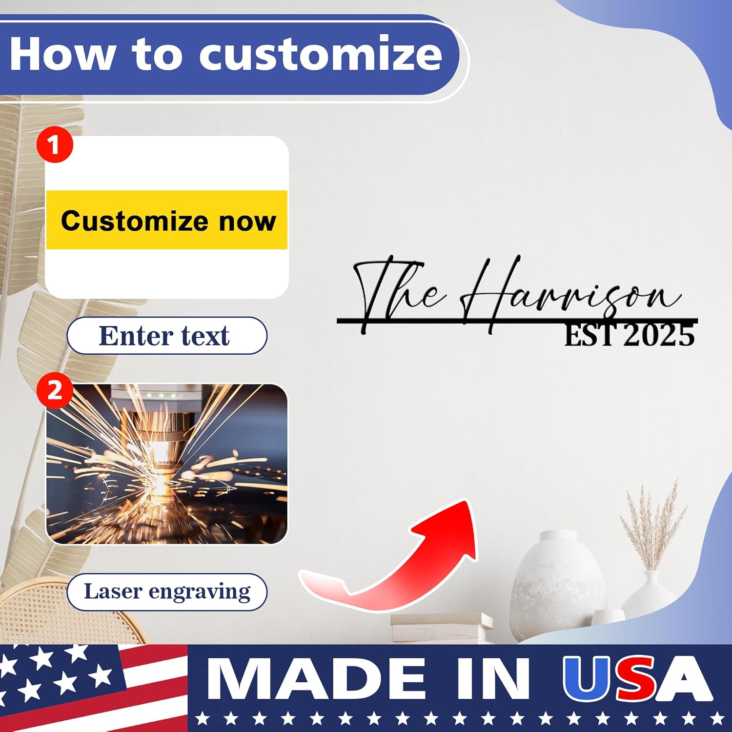 - CUSTOM MONOGRAM METAL SIGNS: Our metal signs are made in the USA, ship quickly. We offer a variety of designs and sizes to choose from. You can customize your name, last name, and anniversary date as a home decor sign, living room wall decor sign, or wedding sign. It is not only the perfect home decoration, but also an excellent way to showcase beautiful memories.